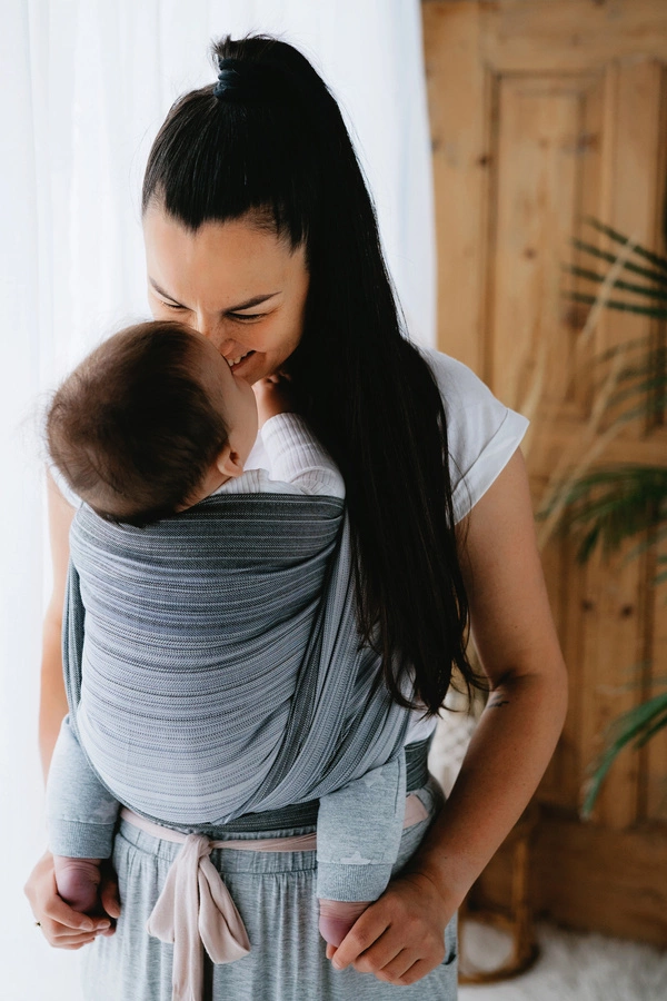 Lightweight at 220 gsm, this wrap is easy to tie and perfect for beginners exploring the world of babywearing. Its contrasting edges make wrapping intuitive and quick, making it ideal for active parents. The neutral light gray and graphite tones complement any outfit, making this sling a stylish choice for both moms and dads.
