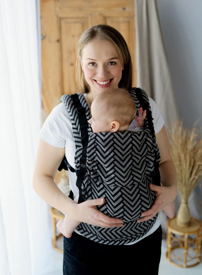 The carrier is sewn from jacquard fabric (the same fabric we use to sew baby slings). It is an airy, breathable fabric that is ideal for carrying at any time of the year.