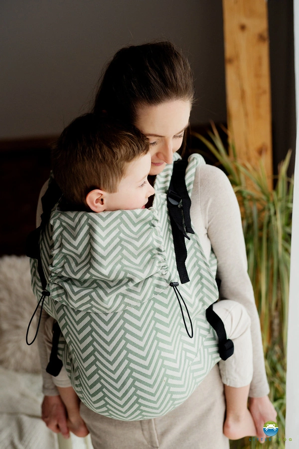 Our preschooler carrier is sewn with jacquard fabric certified to Oeko-Tex Standard 100 (Class 1) (the same fabric we use to make baby slings). It is an airy, breathable fabric that is ideal for carrying at any time of the year.