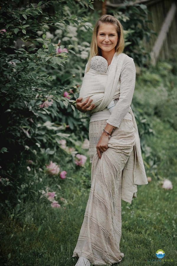 The Linen Summer Meadow Sling is the perfect baby wrap carrier for the entire babywearing journey, whether you’re carrying a toddler or an infant. The fabric is soft from the first use, and the combination of white and beige gives the baby sling a delicate, elegant look, highlighted by the subtle texture of the linen yarn..