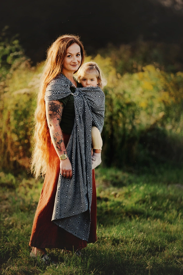 The Inky Cube ring sling in jacquard weave will work perfectly as the first ring sling for carrying babies and toddlers. It is woven from combed cotton and is soft from the first use. Ring Slings are quick to put on, making them accessible to every parent. Simply pull the fabric through the sewn-in rings as instructed, tighten accordingly and you are ready to go! When folded, ring slings take up little space, so they are easy to carry and store, which is important, especially when travelling.